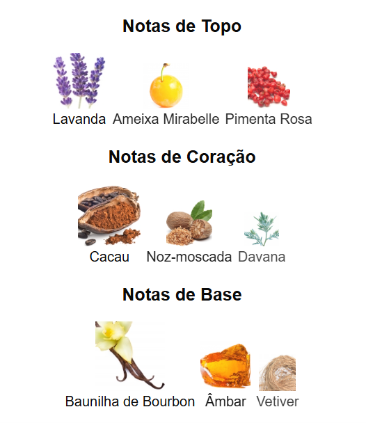 NOTAS DE CORAÇÃO: Cacau, Noz-moscada e Davana.