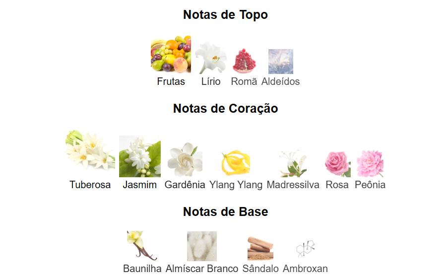 NOTAS DE CORAÇÃO: Tuberosa, Jasmim, Gardênia, Ylang Ylang, Madressilva, Rosa e Peônia.